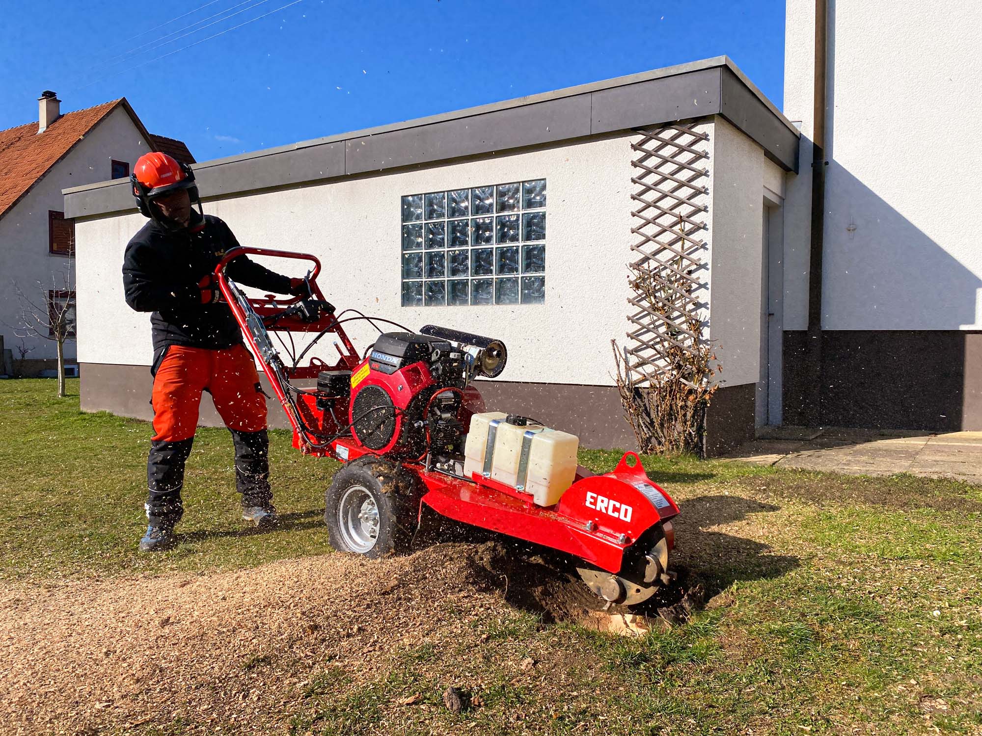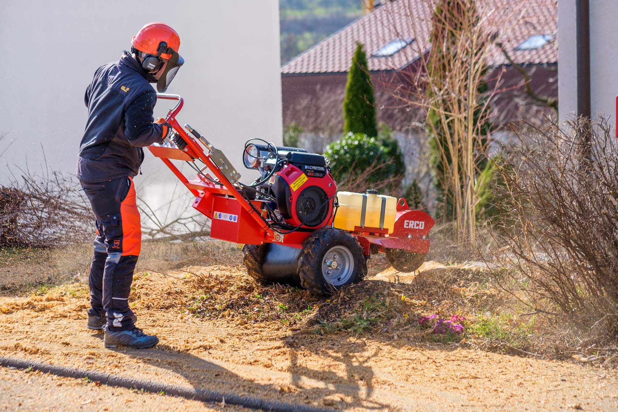 Durch die kompakten Abmessungen und den hydraulischen Fahrantrieb ist das Gerät auch für Einsätze in schwierigem Gelände bestens geeignet. Die Fahrgeschwindigkeit lässt sich vor- und rückwärts stufenlos regulieren. Die acht Hartmetall-Fräszähne gewährleisten auch in hartem Holz eine hervorragende Fräsleistung. Der Holm lässt sich in der Höhe verstellen. Die Anti-Stress-Einrichtung passt die Motordrehzahl automatisch an die jeweiligen Gegebenheiten an. Profigerät für Mietstationen oder Landschaftsgärtner.