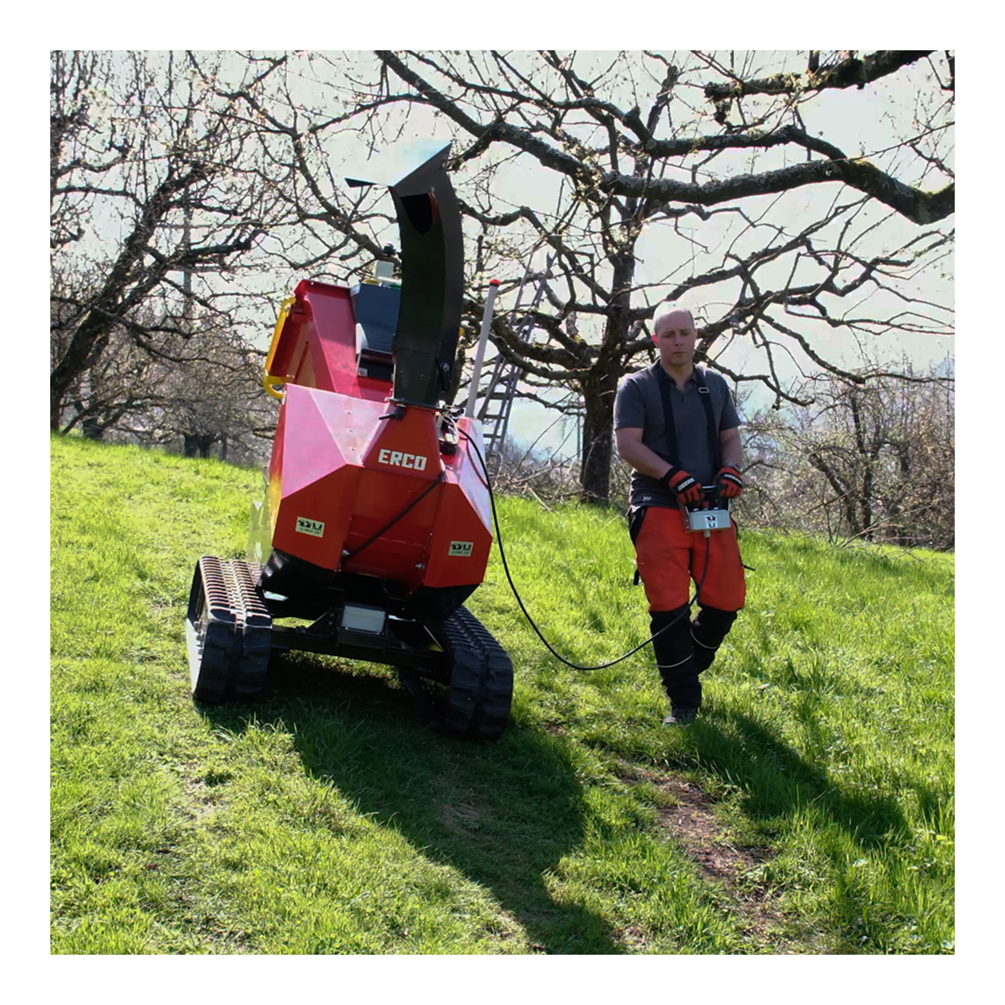 Der hydraulische Raupenantrieb mit kabelgebundener Fernsteuerung ermöglicht präzise Positionierung auch in unwegsamem Gelände. Der Häcksler fährt selbstständig zum Schnittgut – auch an Stellen, die zu Fuß mühsam zu erreichen sind. Die separate Ansteuerung der Raupen macht das Manövrieren intuitiv und einfach. Die robuste Konstruktion meistert Steigungen, loses Gelände und unebene Flächen mit Leichtigkeit.