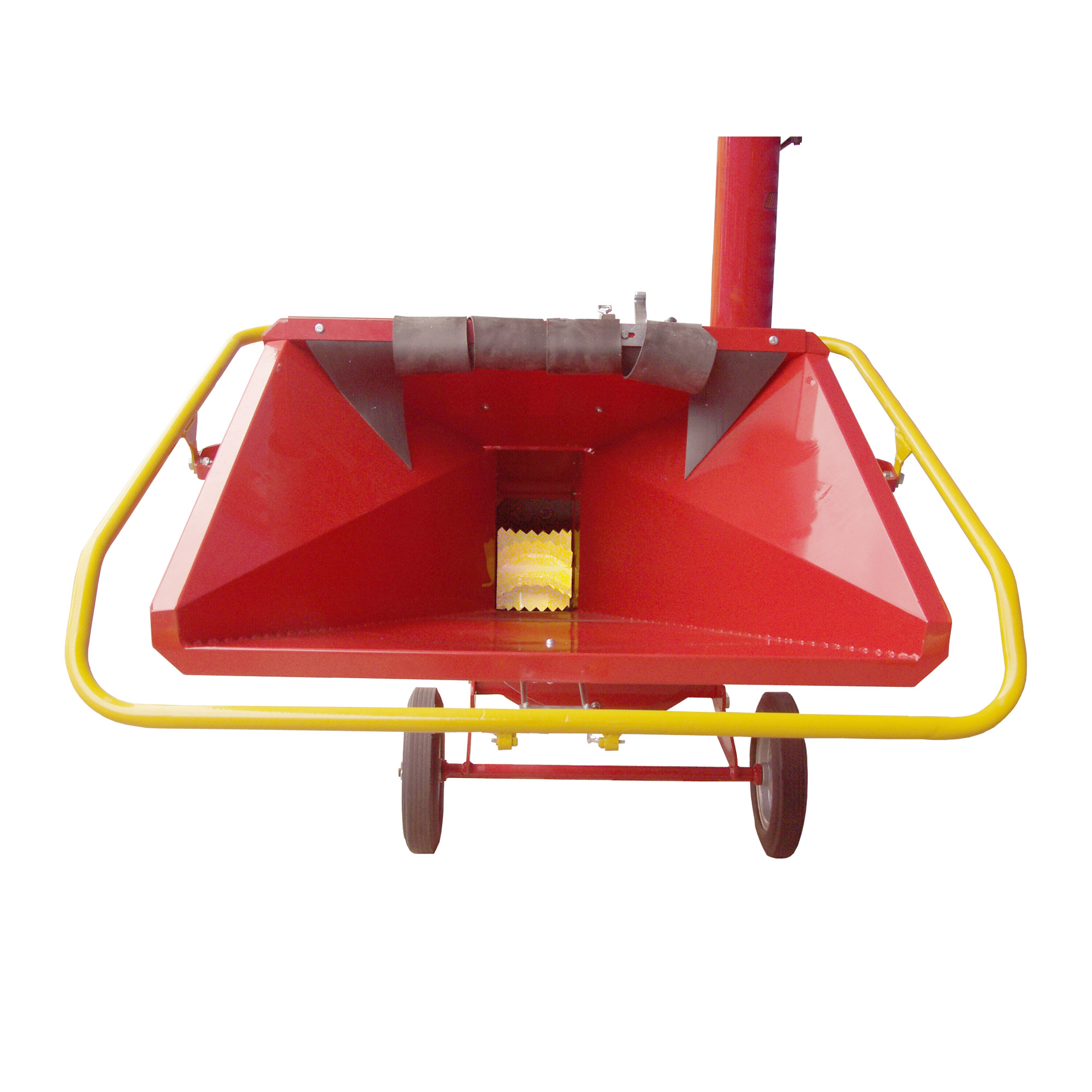 Die Auswurfhöhe von 1.850 mm ermöglicht das direkte Befüllen von Anhängern und Containern auch in unwegsamem Gelände. Der schwenkbare Auswurfbogen bietet flexible Ausrichtung des Häckselguts. Für den Transport lässt sich der Auswurf auf 1.680 mm zusammenklappen – ideal für das Verladen in Transporter.