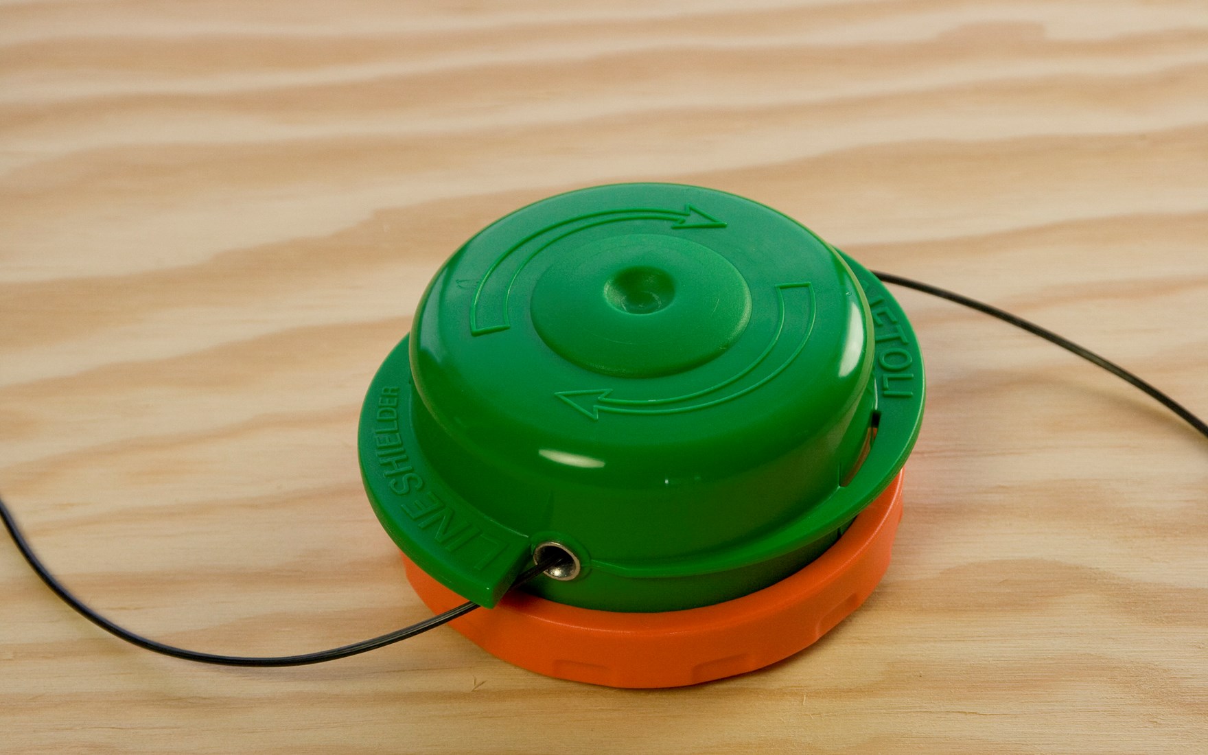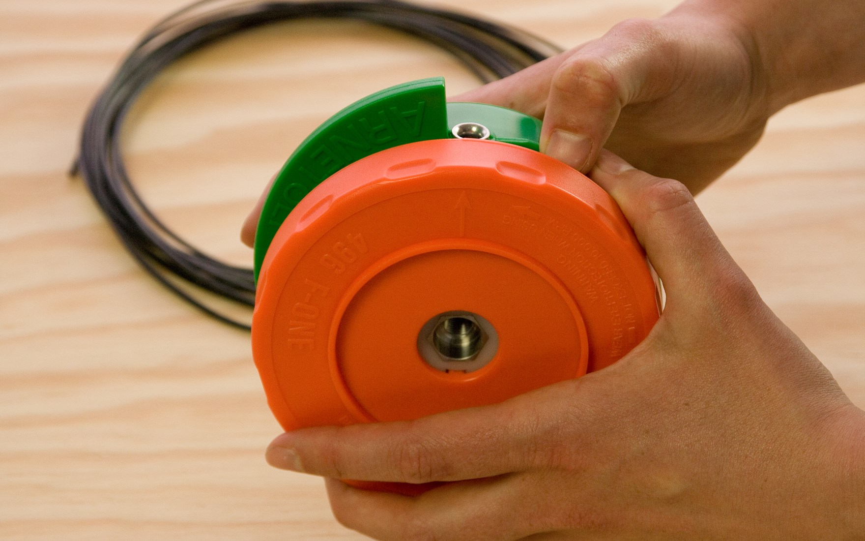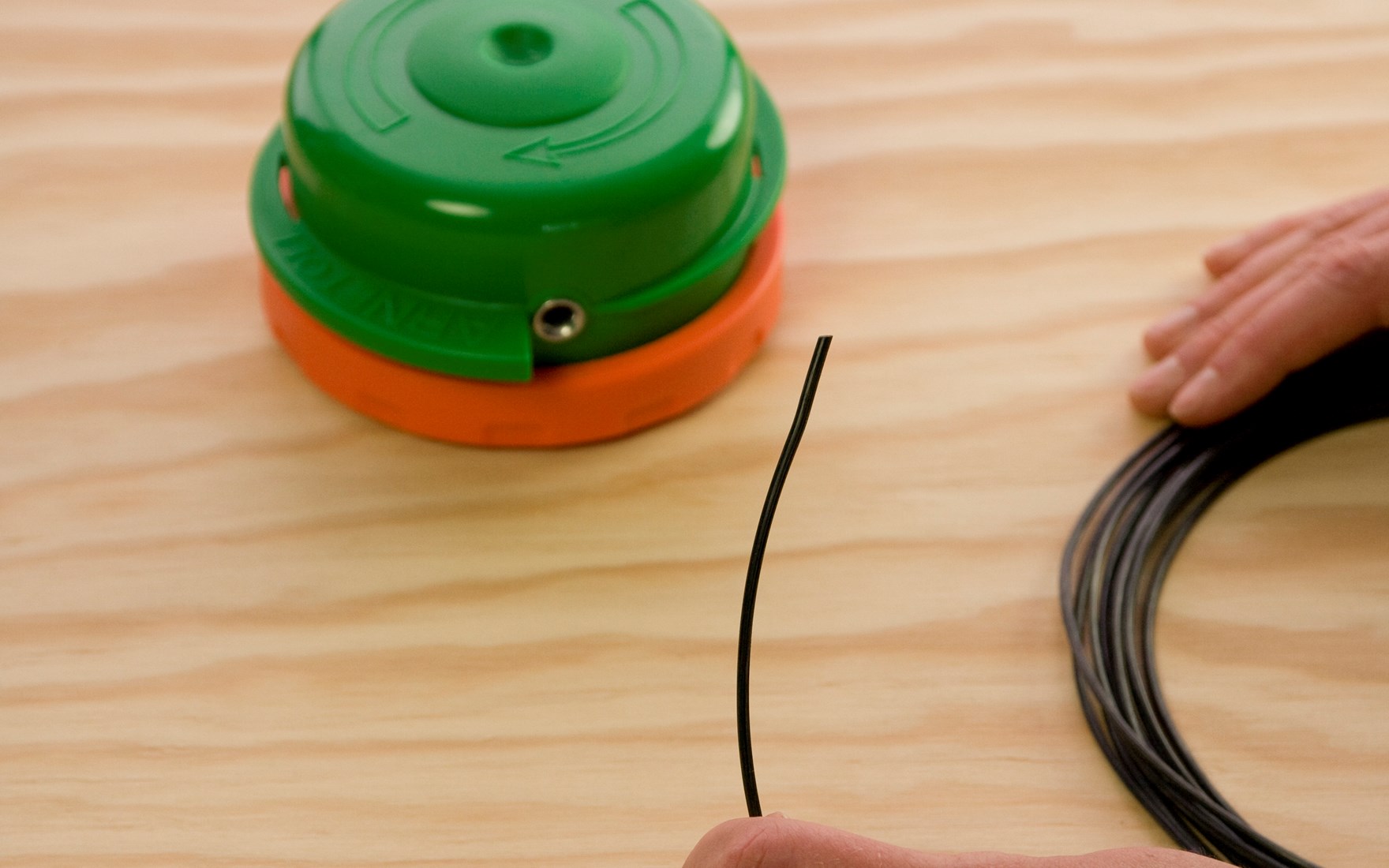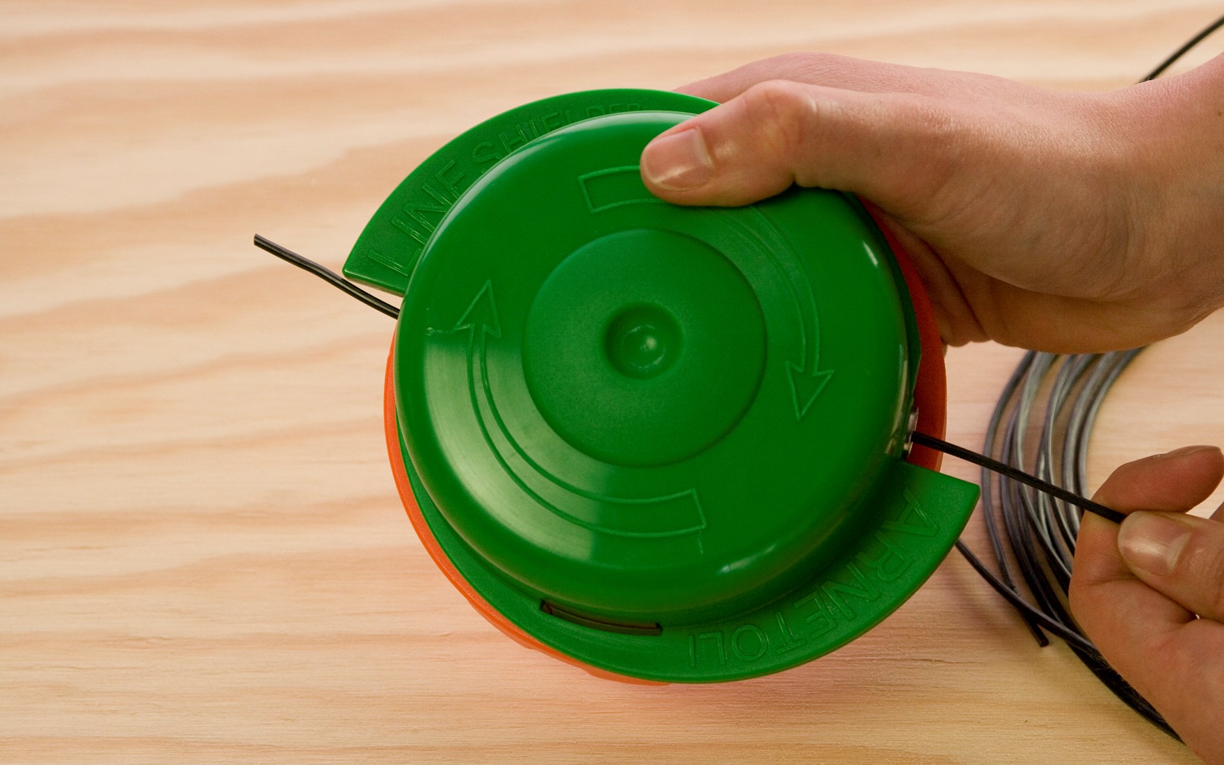 Indem Sie das grüne Oberteil und das orangefarbene Unterteil in entgegengesetzte Richtung drehen, wickeln Sie den Faden im Inneren der Spule auf. Die Pfeile auf dem Fadenkopf geben die Richtungen vor. Der Fadenkopf rastet während des Drehens spür- und hörbar ein.