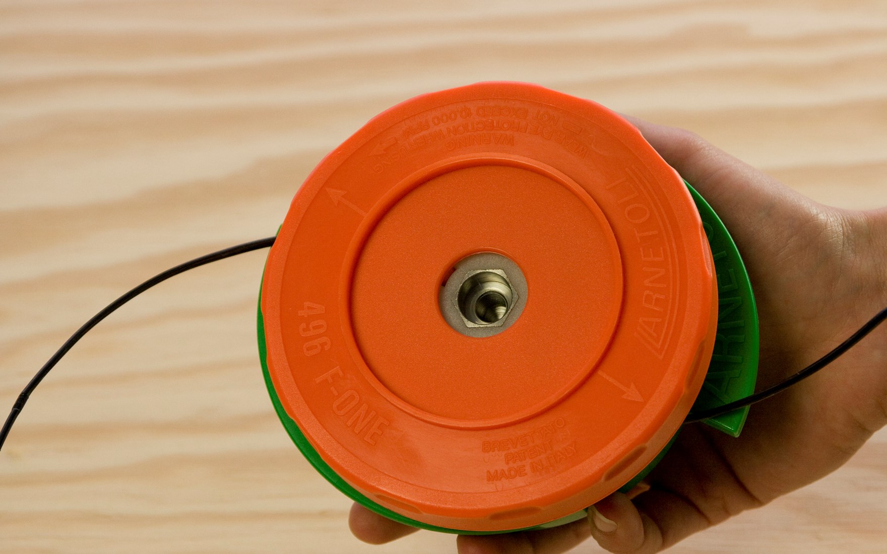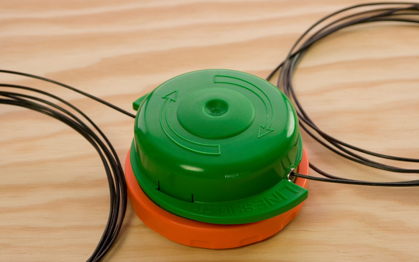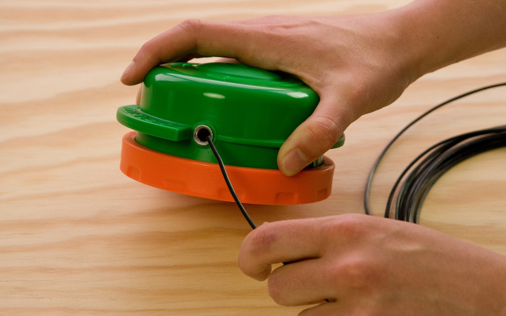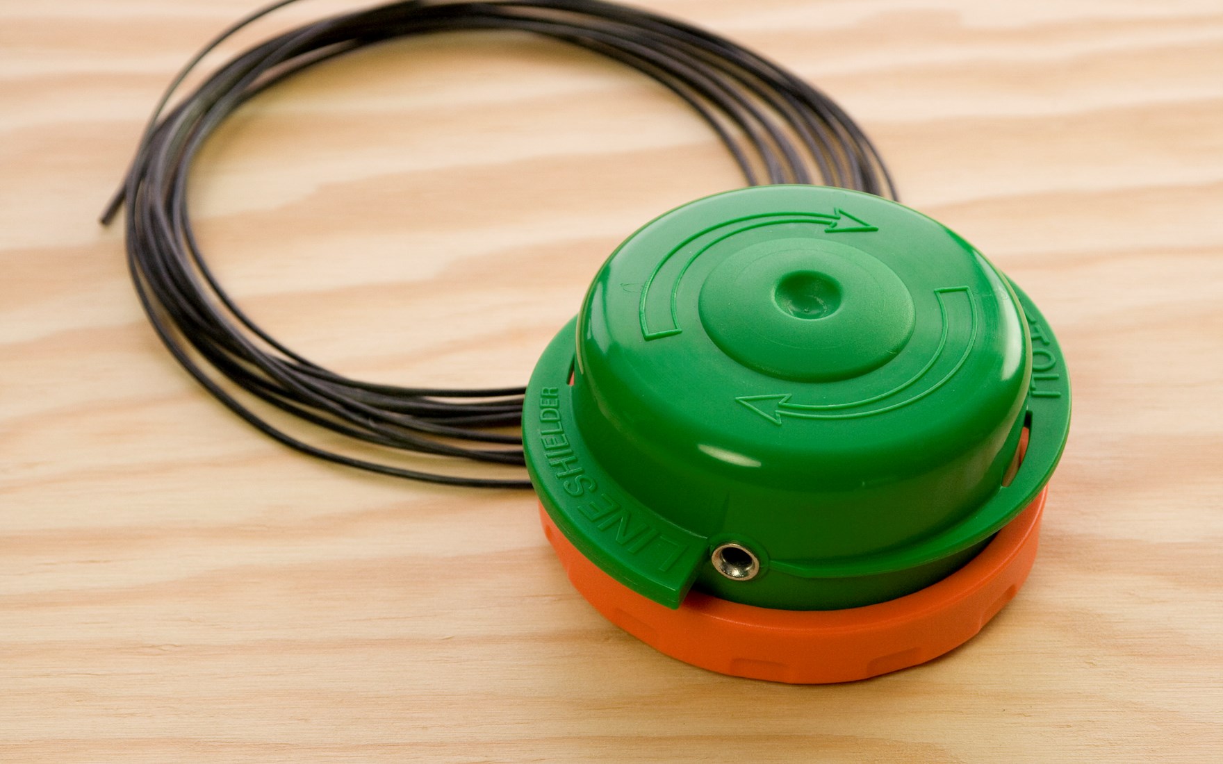 Indem Sie das grüne Oberteil und das orangefarbene Unterteil in entgegengesetzte Richtung drehen, wickeln Sie den Faden im Inneren der Spule auf. Die Pfeile auf dem Fadenkopf geben die Richtungen vor. Der Fadenkopf rastet während des Drehens spür- und hörbar ein.