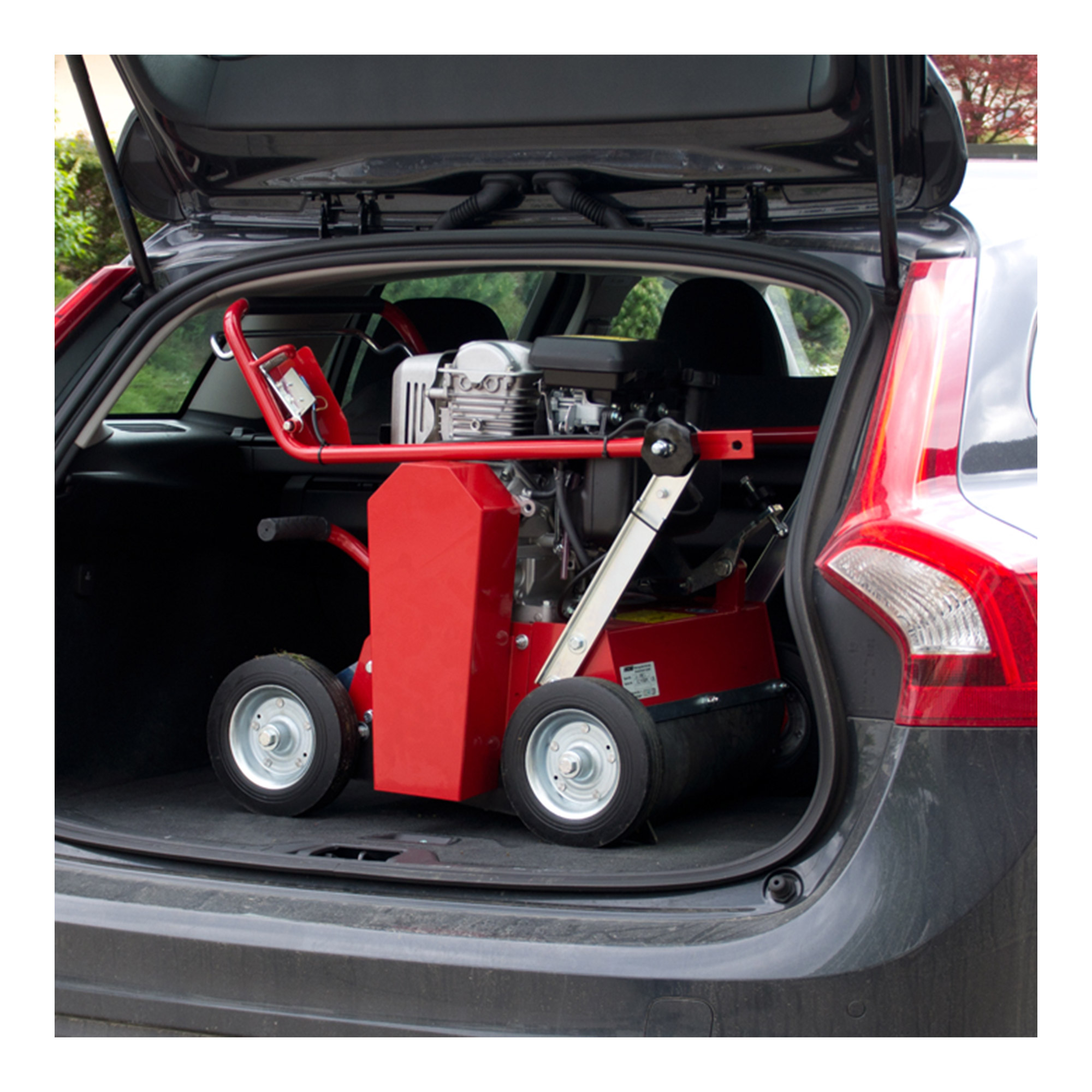 Scharfe Vertikutiermesser reißen den verdichteten Rasenfilz auf und kämmen abgestorbenes Gras und Moos heraus. Die pendelnden Messerklingen werden beim ERCO V-620 durch Federn seitlich verspannt. Wenn der Widerstand, etwa durch Fremdkörper, zu groß ist, weichen die Messerklingen aus. Durch den umklappbaren Führungsholm lässt sich der Vertikutierer problemlos und sicher im Kofferraum eines PKW-Kombi transportieren. Durch die Tragegriffe kann das Gerät einfach in einen Kofferraum gehoben werden.